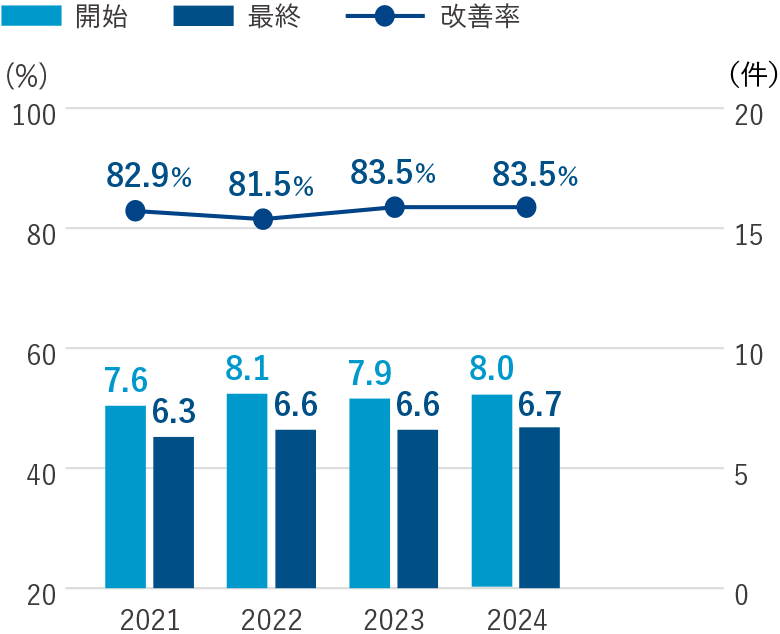HbA1cが年4回以上検査された患者さまを継続通院(当院での管理症例)と定義し、改善率を評価しました。したがってここでのHbA1c改善率は、糖尿病患者さま全体のうち管理が困難と考えられる40数%のデータです。