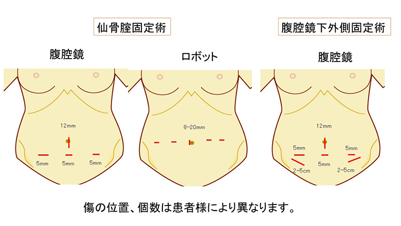 子宮脱(骨盤臓器脱)の手術には腟式手術、腹腔鏡下手術、ロボット支援下手術があります。腟式手術は再発率が高いため、腹腔鏡下手術、ロボット支援下手術を選択することが多くなっております。当院には複数の日本産科婦人科内視鏡学会技術認定医が常駐し、開腹手術だけでなく、適応のある患者さまには腹腔鏡下手術、ロボット支援下手術も積極的に行っております。